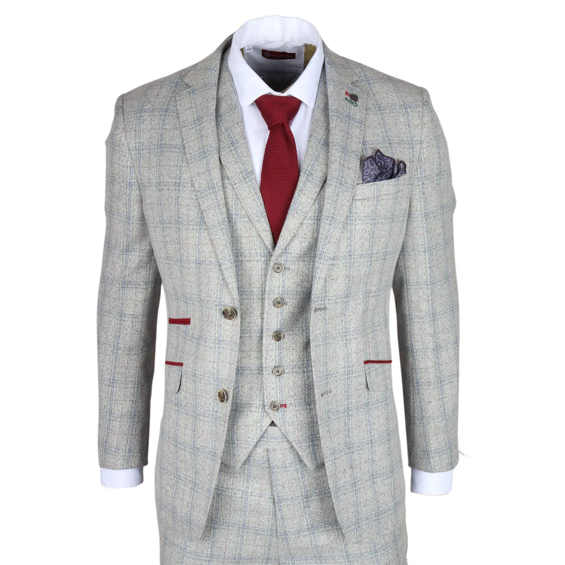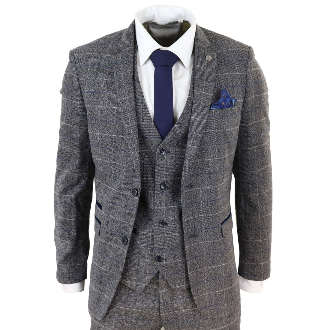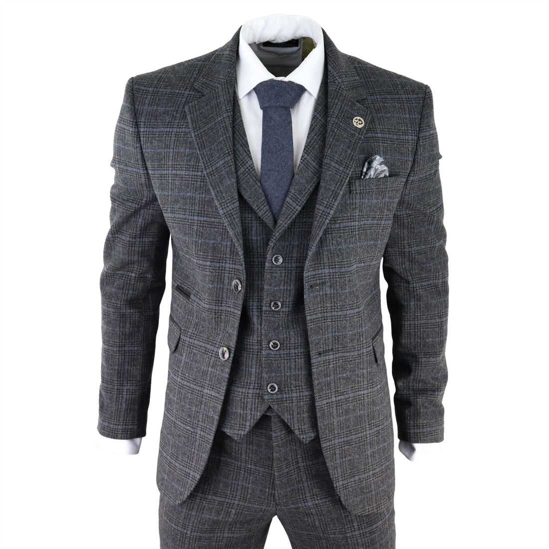 Mens Grey Tweed 3 Piece Suit Blue Check Vintage 1920s Gatsby Blinders Tailored Fit