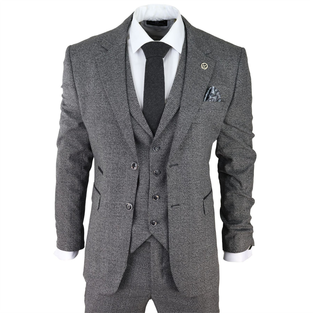 Mens Classic 3 Piece Suit Prince Of Wales Check Grey Tailored Fit Vintage Wedding
