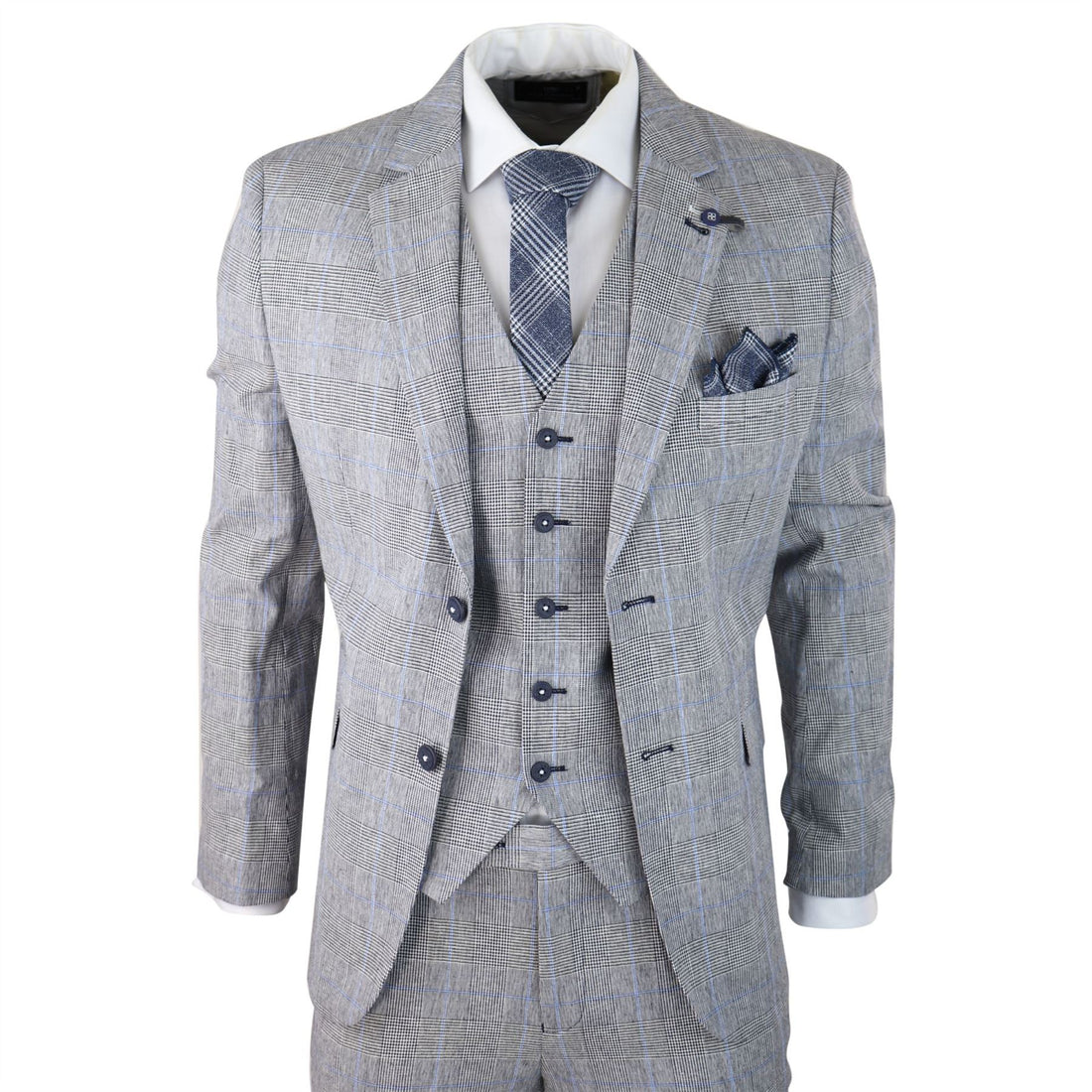 Mens 3 Piece Summer Suit Grey Check Blue Black Tailored Fit Classic Wedding Formal