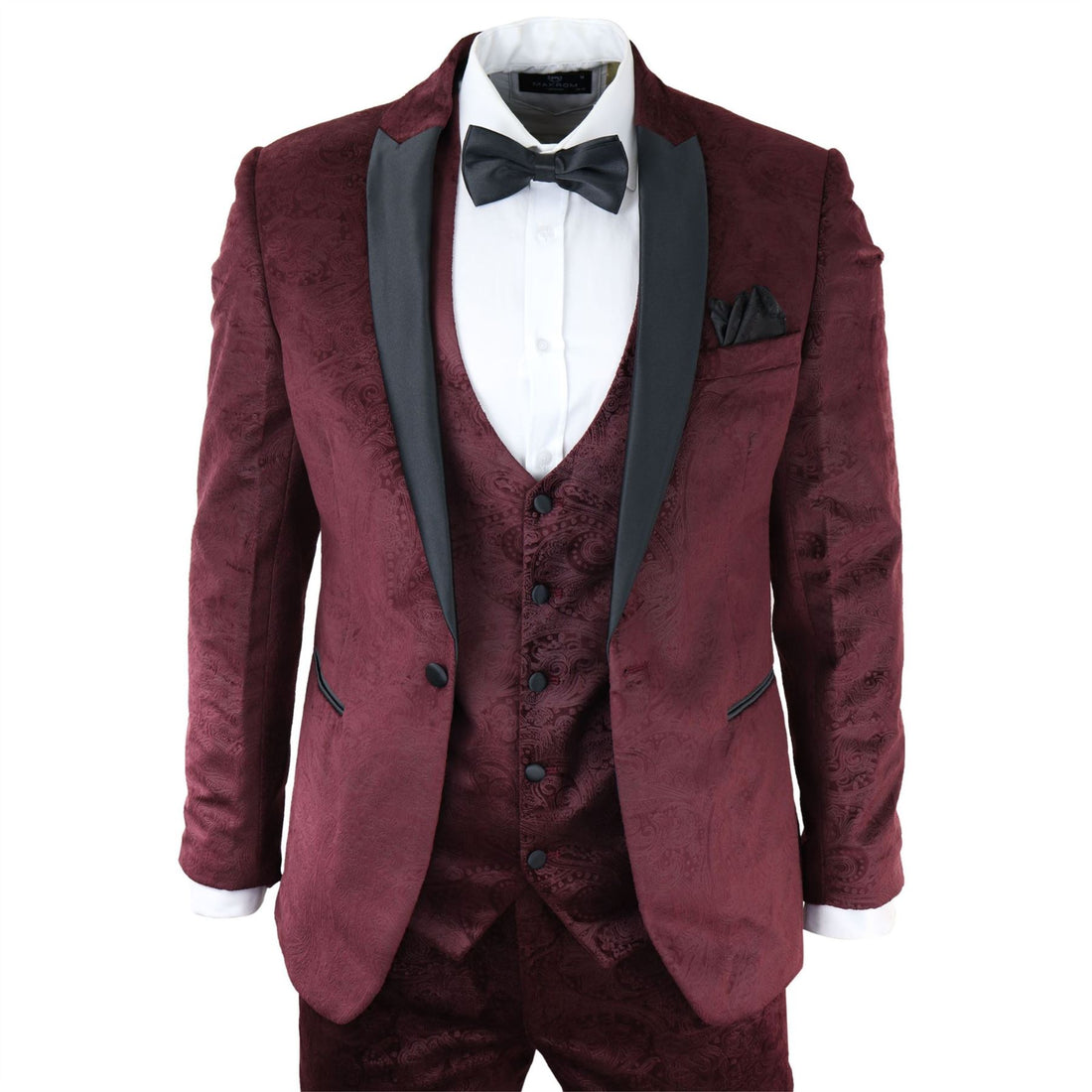 Mens Marc Darcy Velvet Paisley Burgundy Fit 3 Piece Suit Tuxedo Dinner Jacket Wedding