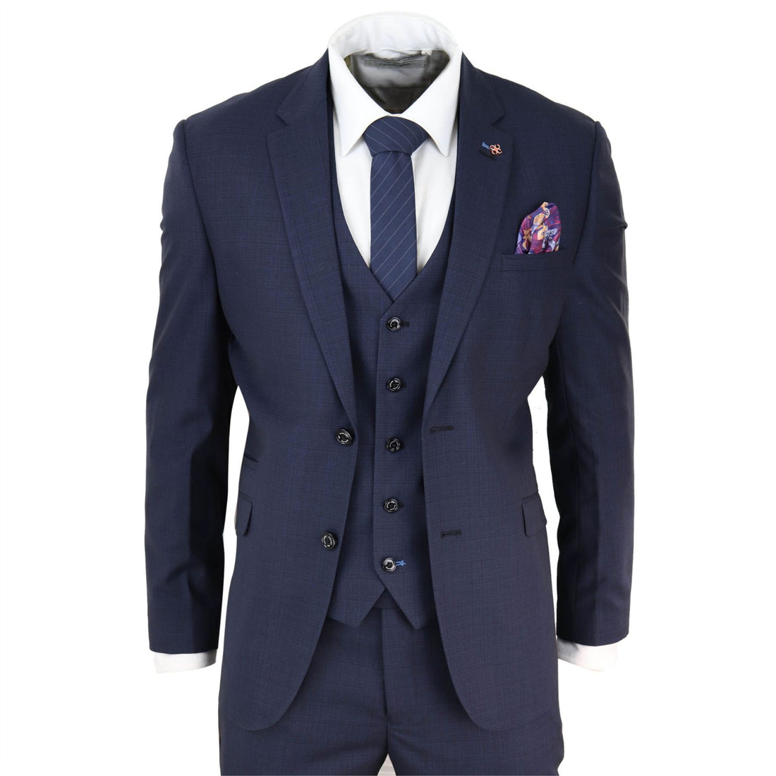 Mens 3 Piece Suit Navy Tailored Fit Classic Retro Vintage Wedding Prom Office