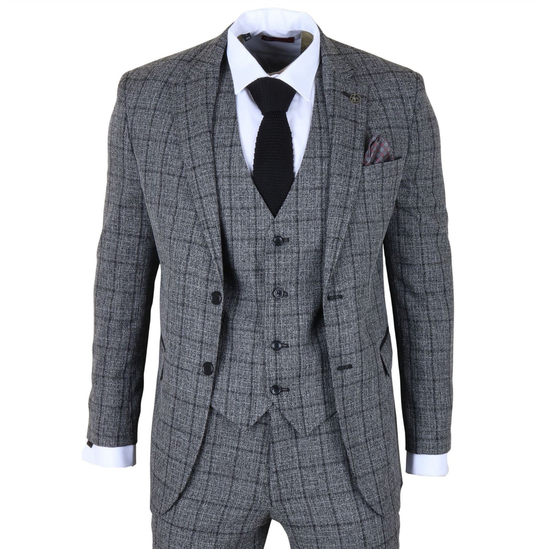 * Classic Tweed Check Fabric: This 3-piece suit is crafted from textured tweed check material,...