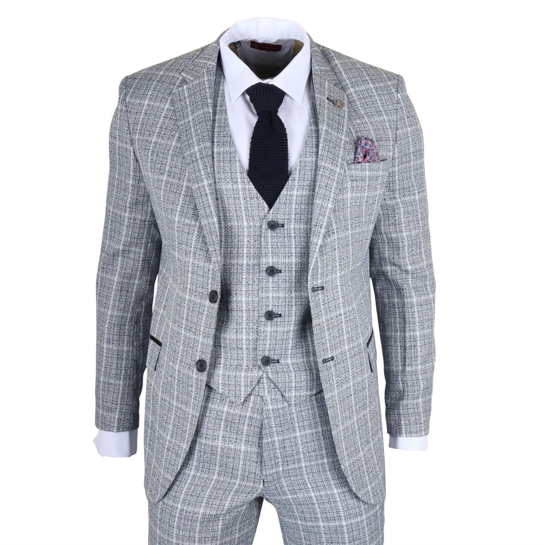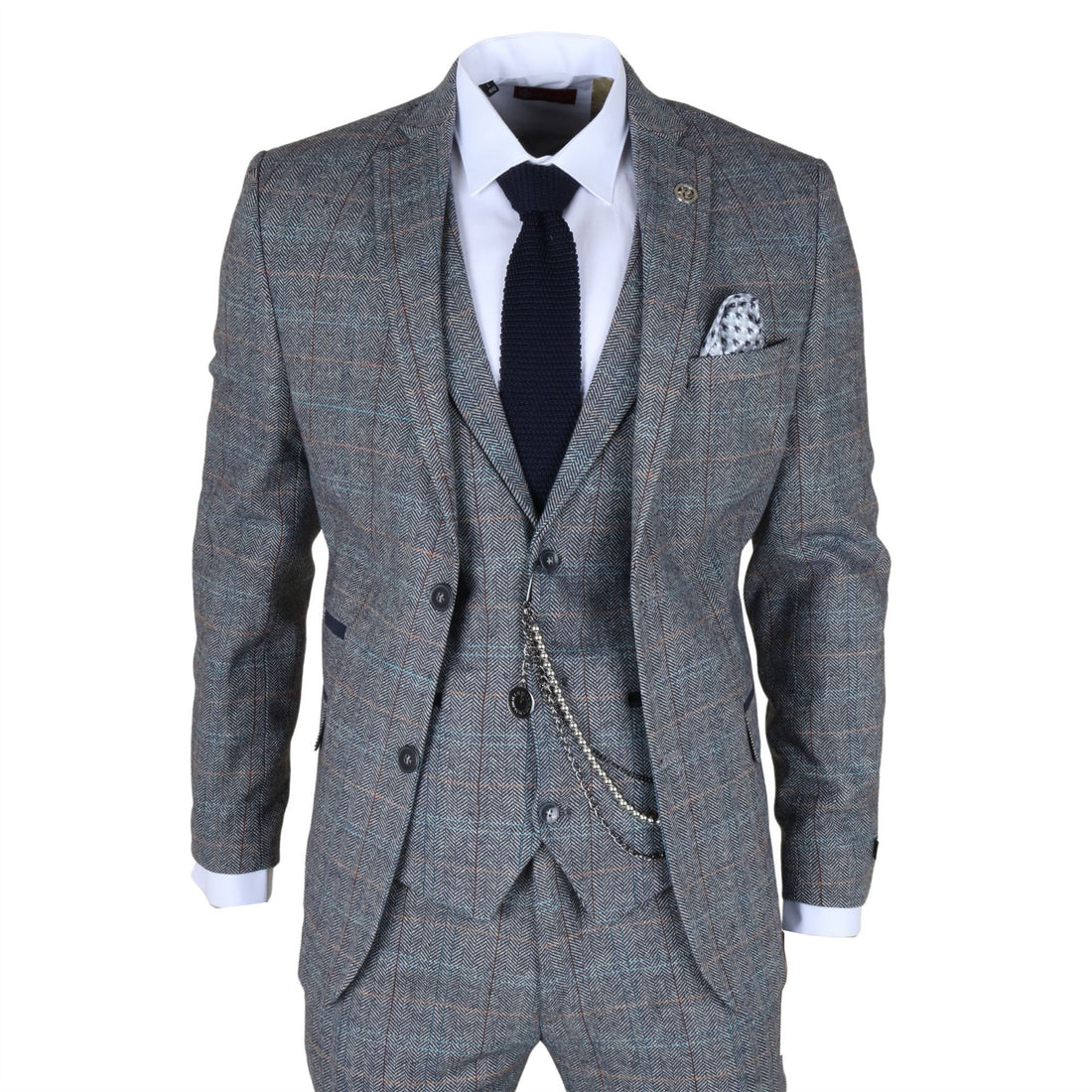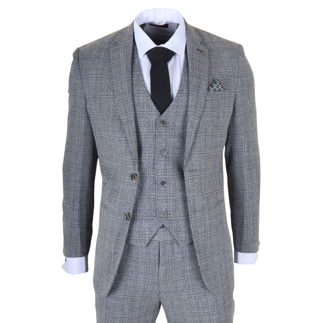 STZ74 - Men's 3 Piece Suit Wool Tweed Light Blue Grey Check