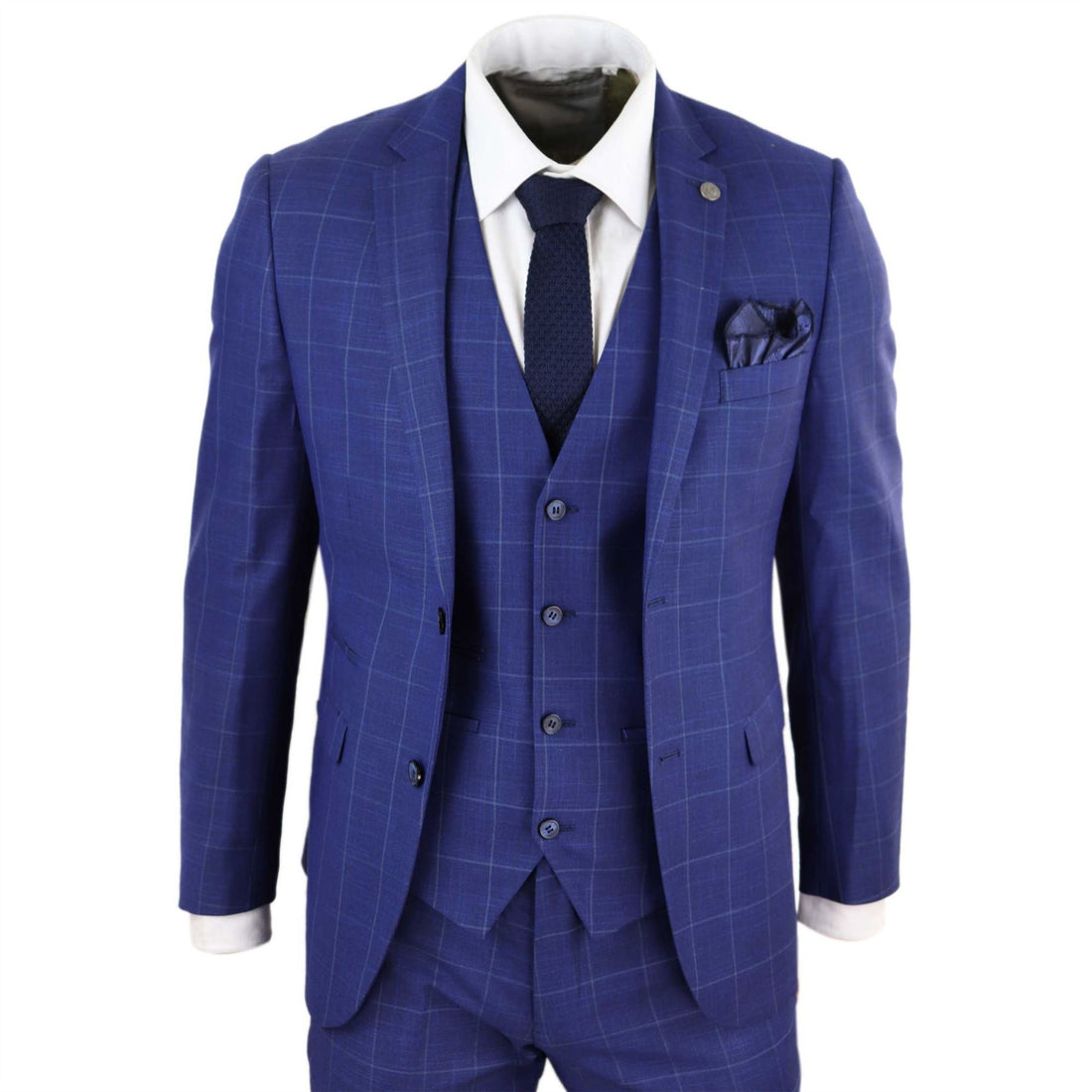 Mens 3 Piece Suit Royal Blue Prince Of Wales Check Suit Classic Wedding Formal