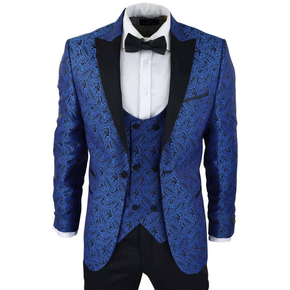 Mens Paisley Tuxedo Blazer And Waistcoat Brocade Dinner Jacket Satin Black Blue