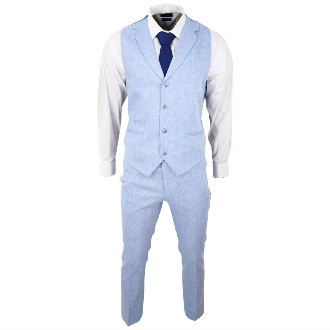 Mens Summer Suit Waistcoat Trousers Linen Smart Formal Baby Blue Wedding
