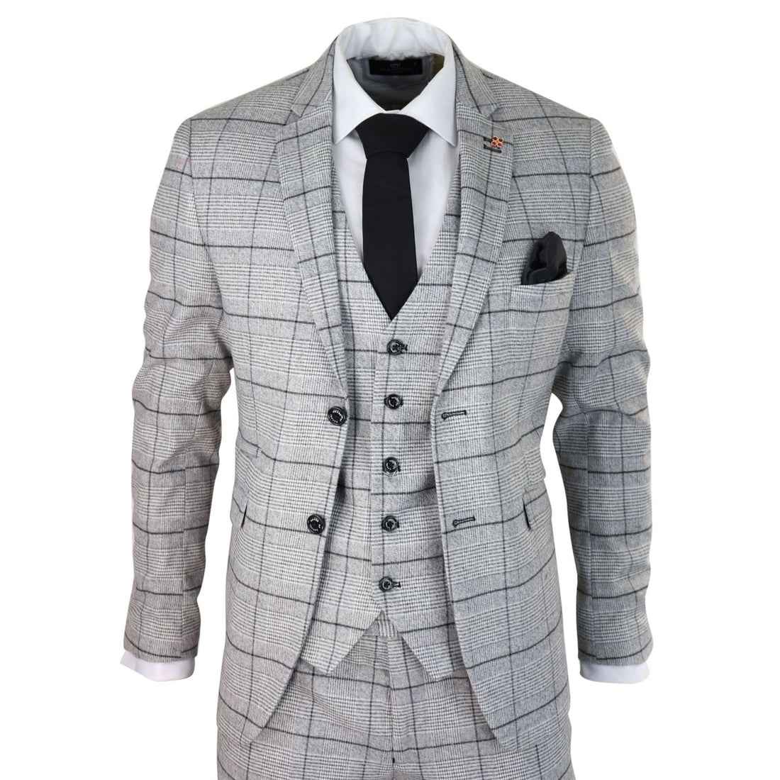 Mens Tweed Light Grey 3 Piece Suit Tailored Fit Classic Vintage 1920s Wedding
