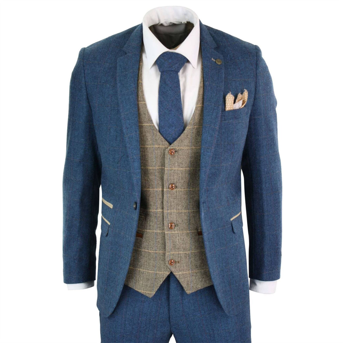 Mens 3 Piece Blue Suit Herringbone Tweed Check Tailored Fit 1920s Wedding Prom