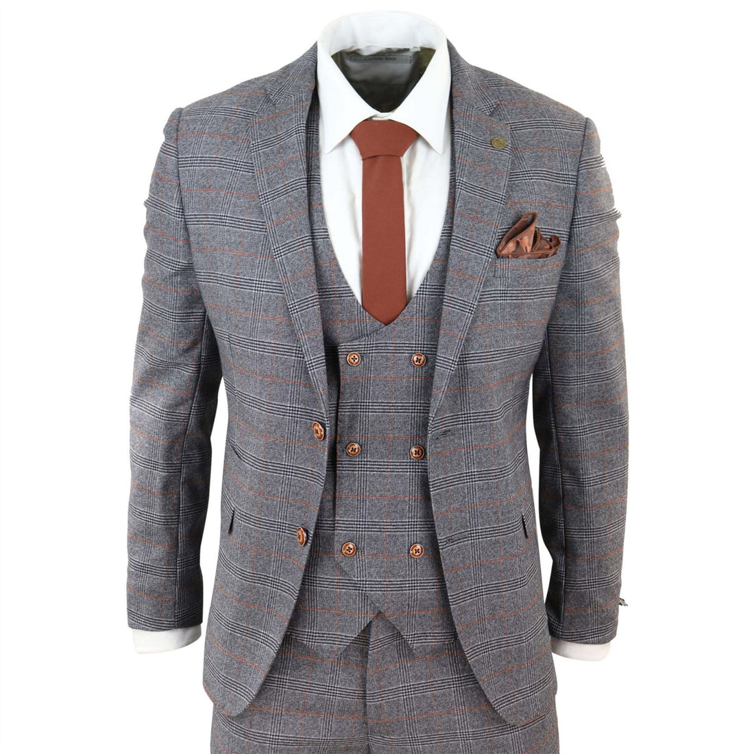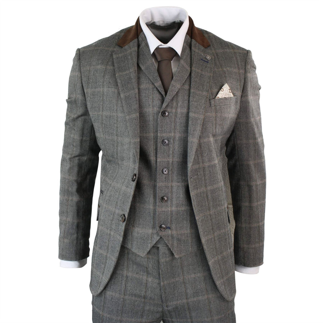 Mens 3 Piece Check Suit Tweed Black Brown Tailored Fit Wedding Peaky Classic