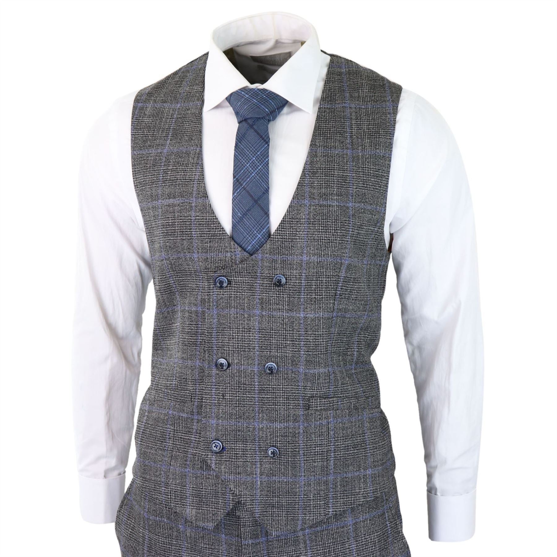 Mens 3 Piece Tailored Fit Suit Check Grey Blue Double Breasted Vintage Wedding