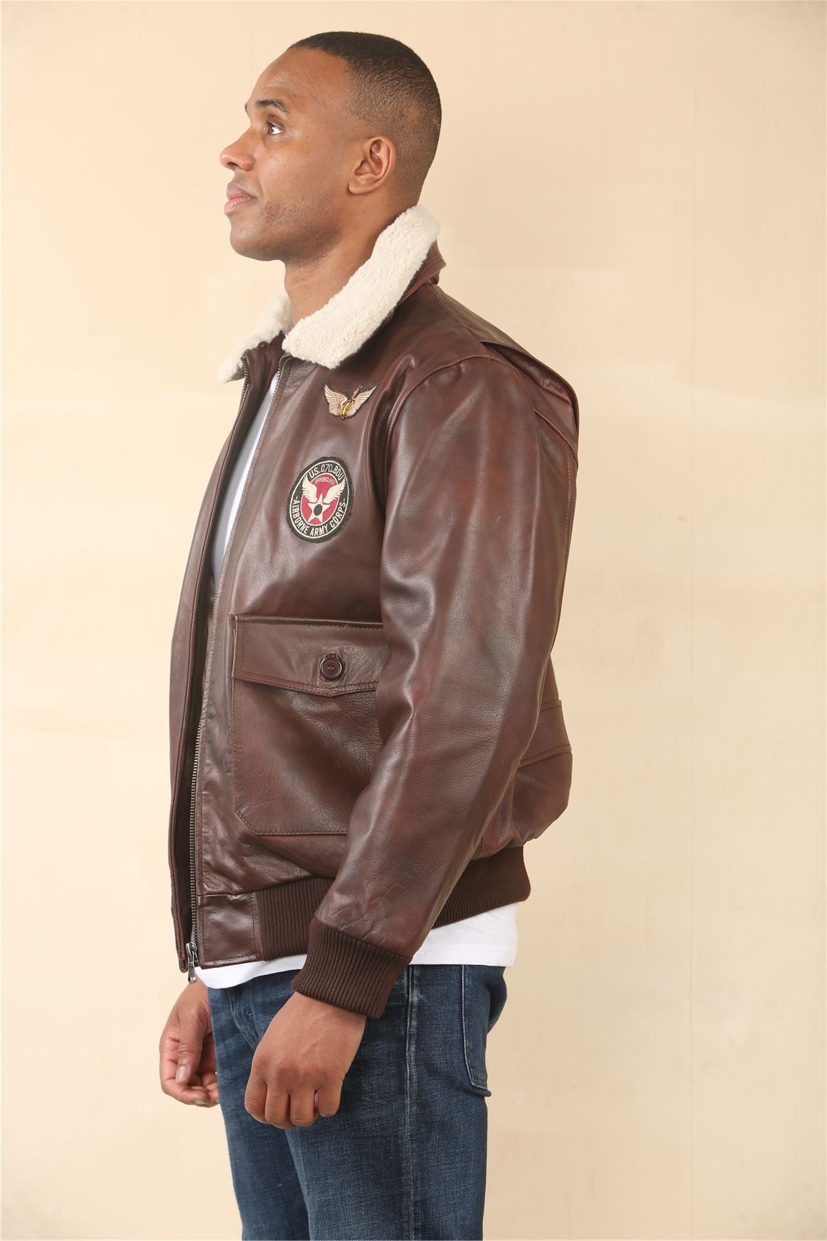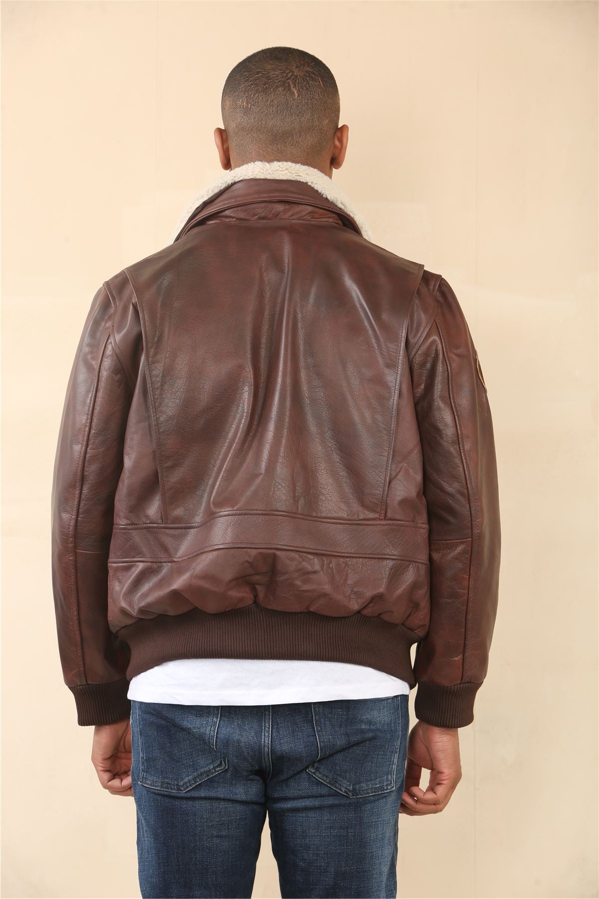 * Premium Cowhide Leather Construction: Crafted from high-quality brown cowhide leather, this aviator bomber jacket offers durability, a sophisticated finish, and long-lasting wear