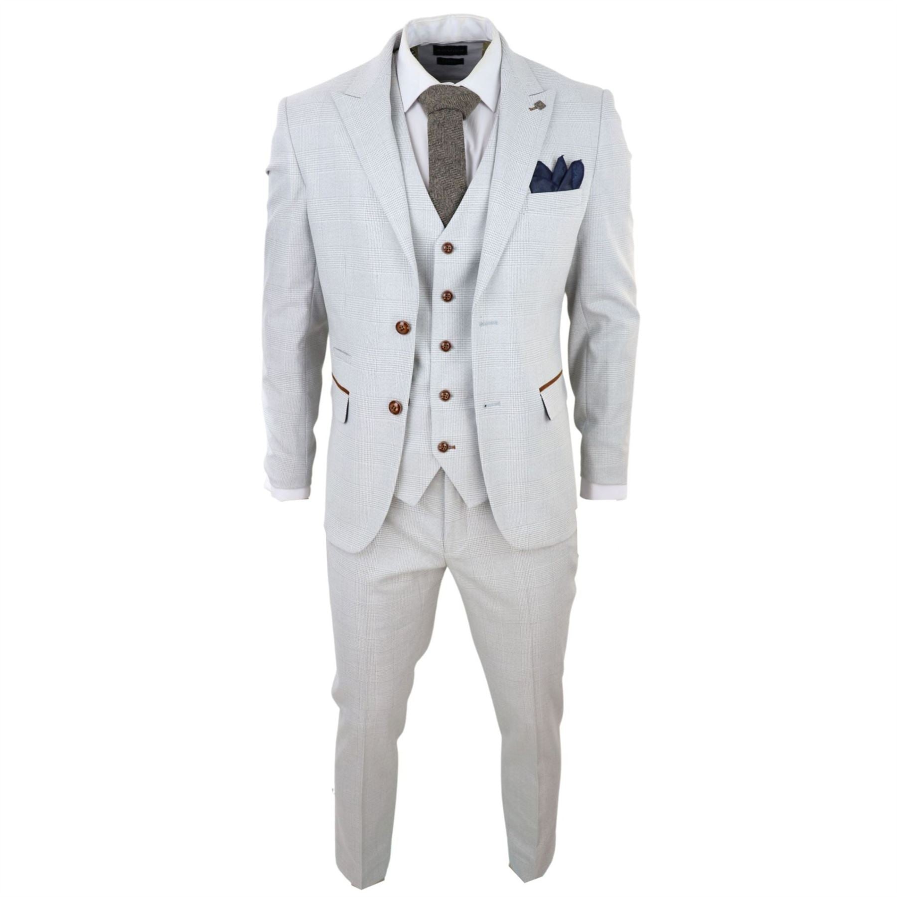 Mens Grey Stone 3 Piece Tweed Check Suit Wedding Prom Tailored Fit Brown Trim