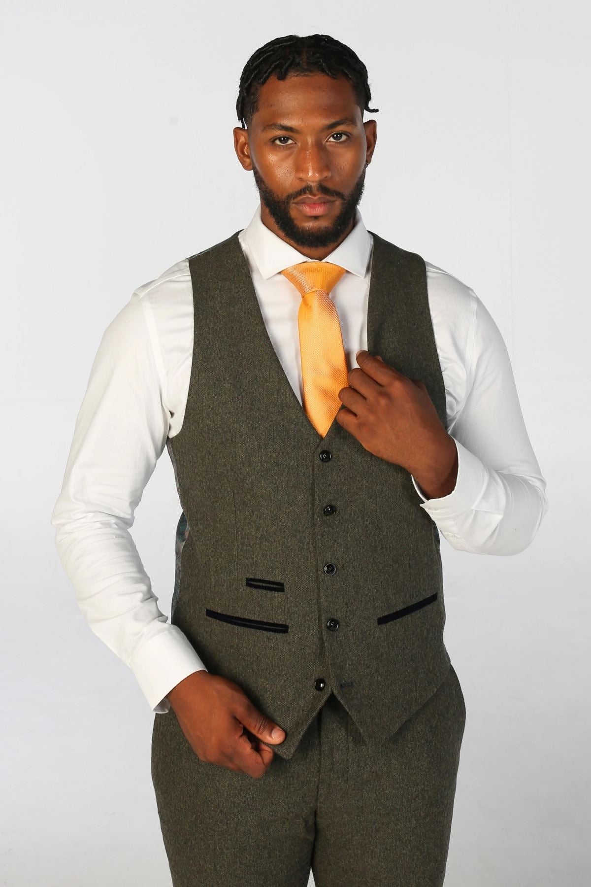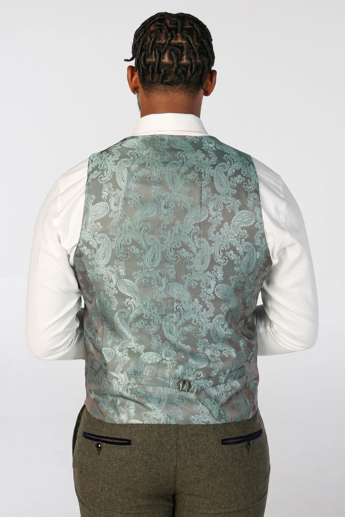 * Olive Green Tweed Finish: The suit's rich olive green hue in a classic tweed pattern brings a unique yet versatile color to your wardrobe, suitable for both business and social events