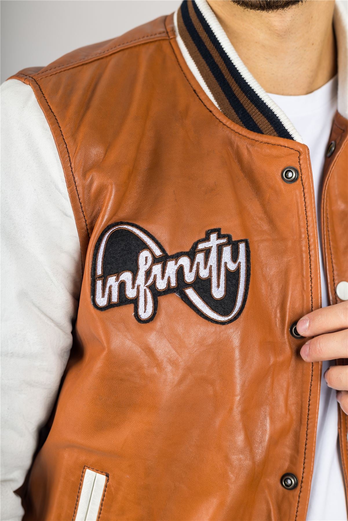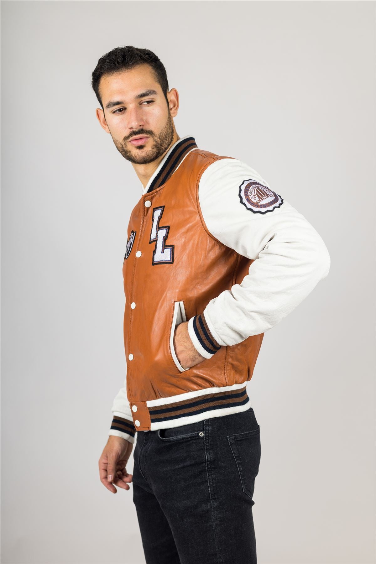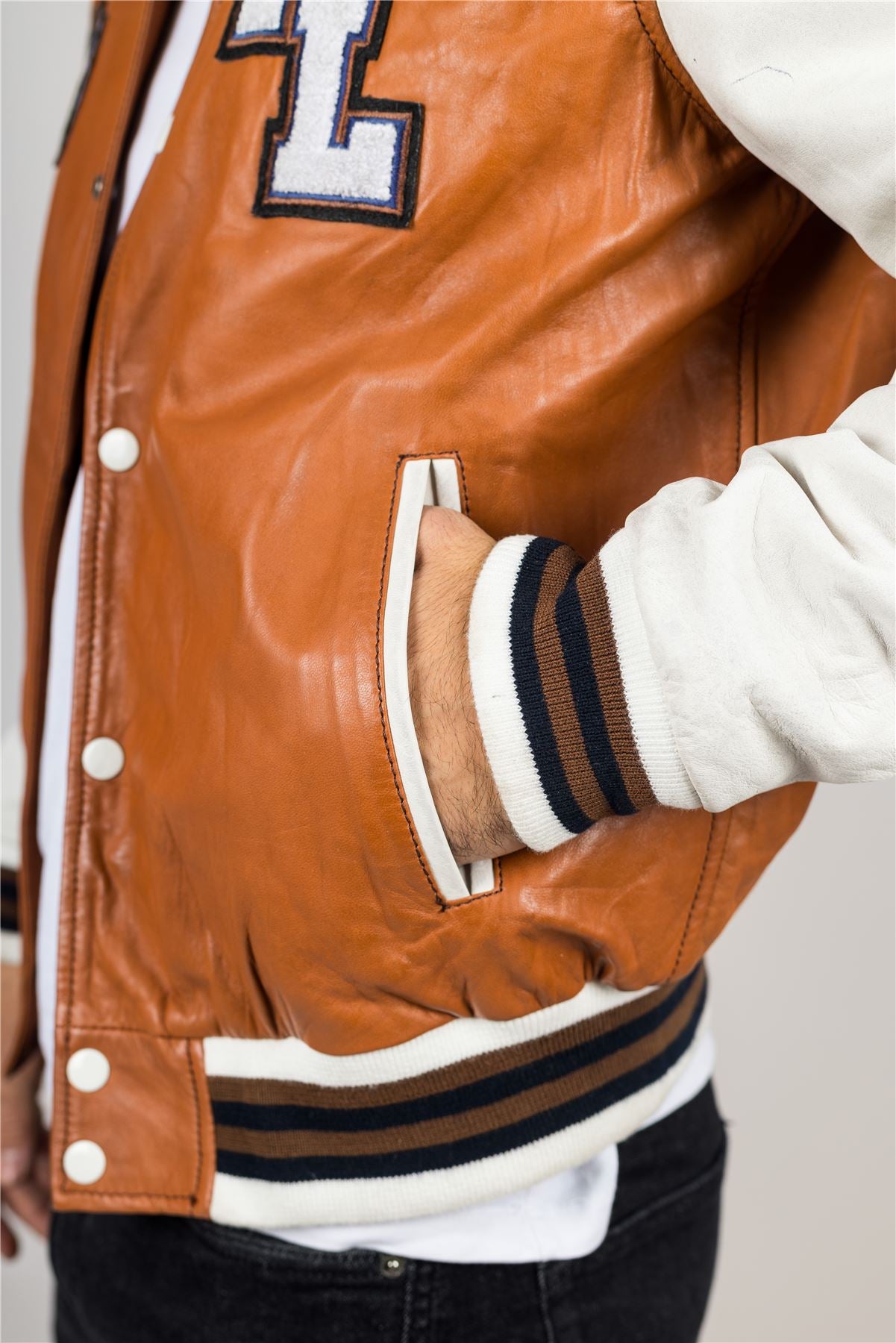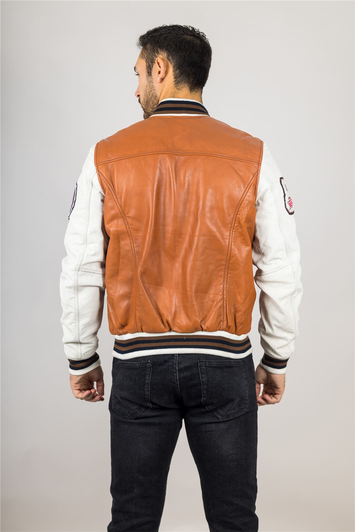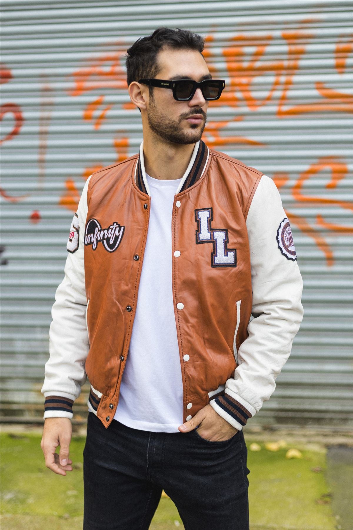 Men's Tan Brown Genuine Leather Bomber Jacket Baseball Letterman Coat