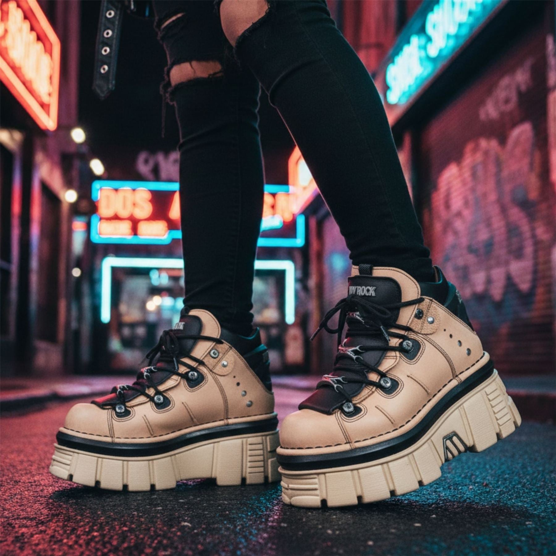 * Bold Gothic and Punk Aesthetic: Featuring a striking beige and black color combination, these boots make a strong style statement for alternative fashion enthusiasts